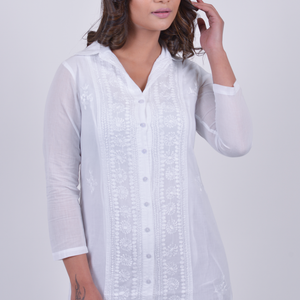 The Dubai dress is an elegant white midi featuring intricate floral embroidery along the front panel and delicate button-down detailing.