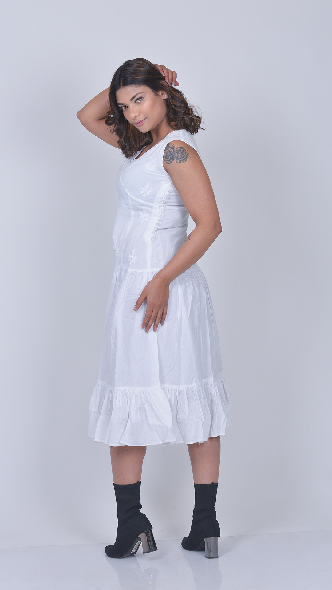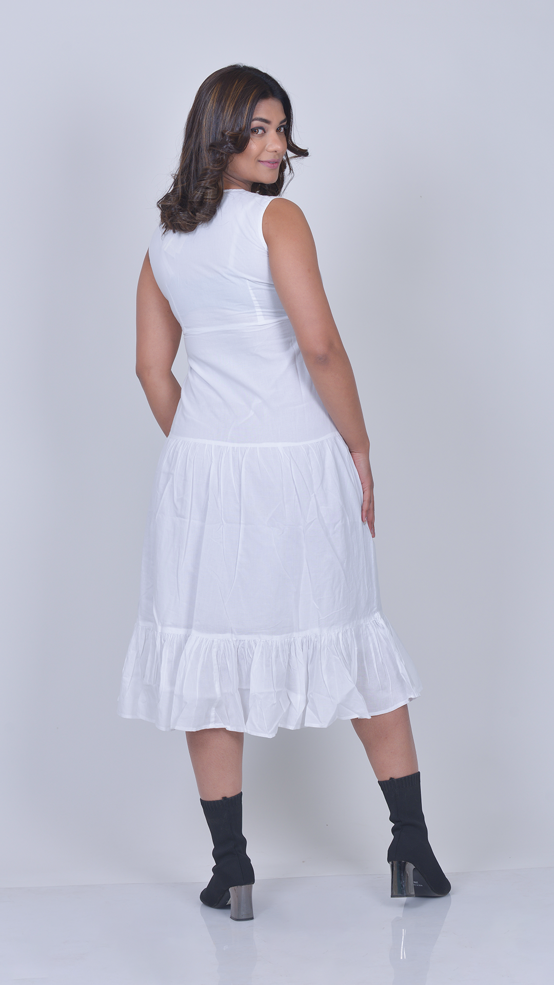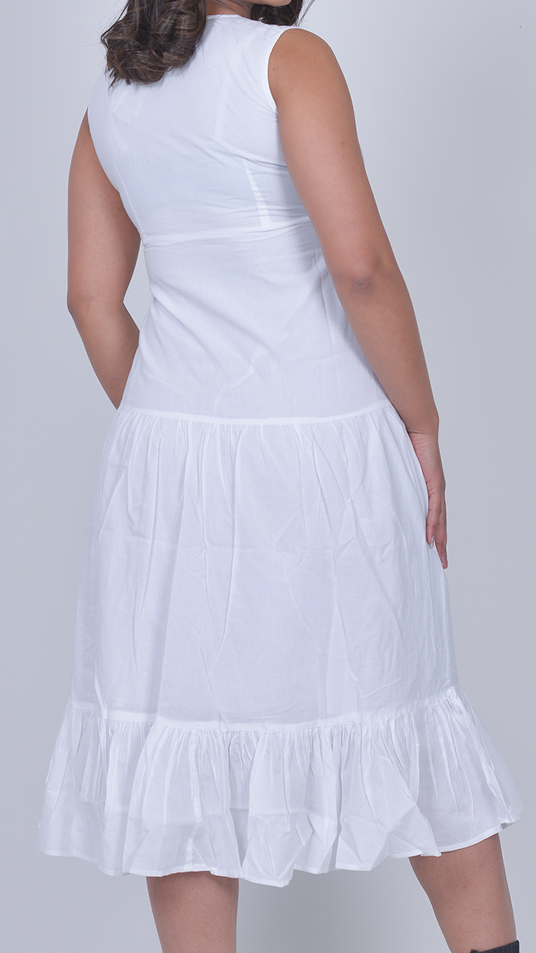 The Kaya dress is a breezy white sleeveless midi featuring delicate floral embroidery and a soft V-neckline.Designed with a gently gathered waist and a flounced hem, it creates a light, feminine silhouette with effortless charm.