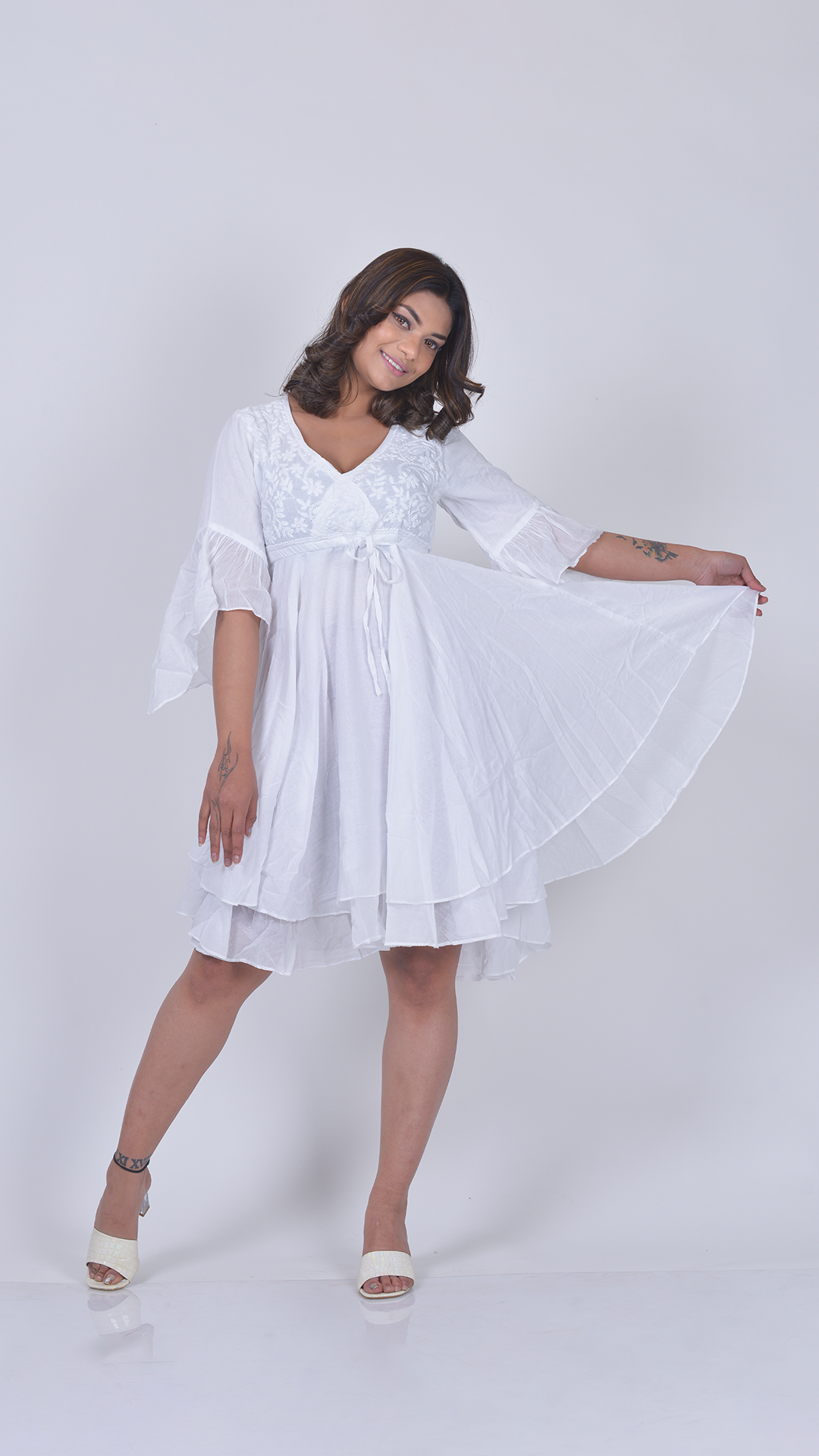 The Shalini Dress is a graceful white ensemble that blends softness with feminine charm. Featuring a delicately embroidered bodice and a flattering V-neckline, it beautifully enhances the silhouette while maintaining a light, airy feel.