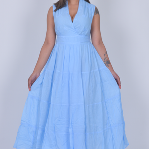 The sleeveless design keeps it light and breezy, while the flowing, tiered skirt adds volume and movement with every step. Delicate embroidery details subtly elevate the look, making it perfect for brunches, summer gatherings, vacations, or daytime celebrations.