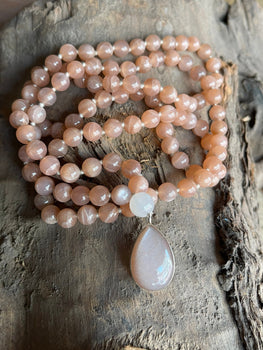 Peach Moonstone Mala with 925 Sterling Silver Peach Moonstone Pendant , 108 japa mala beads,Crystal Beaded Necklace