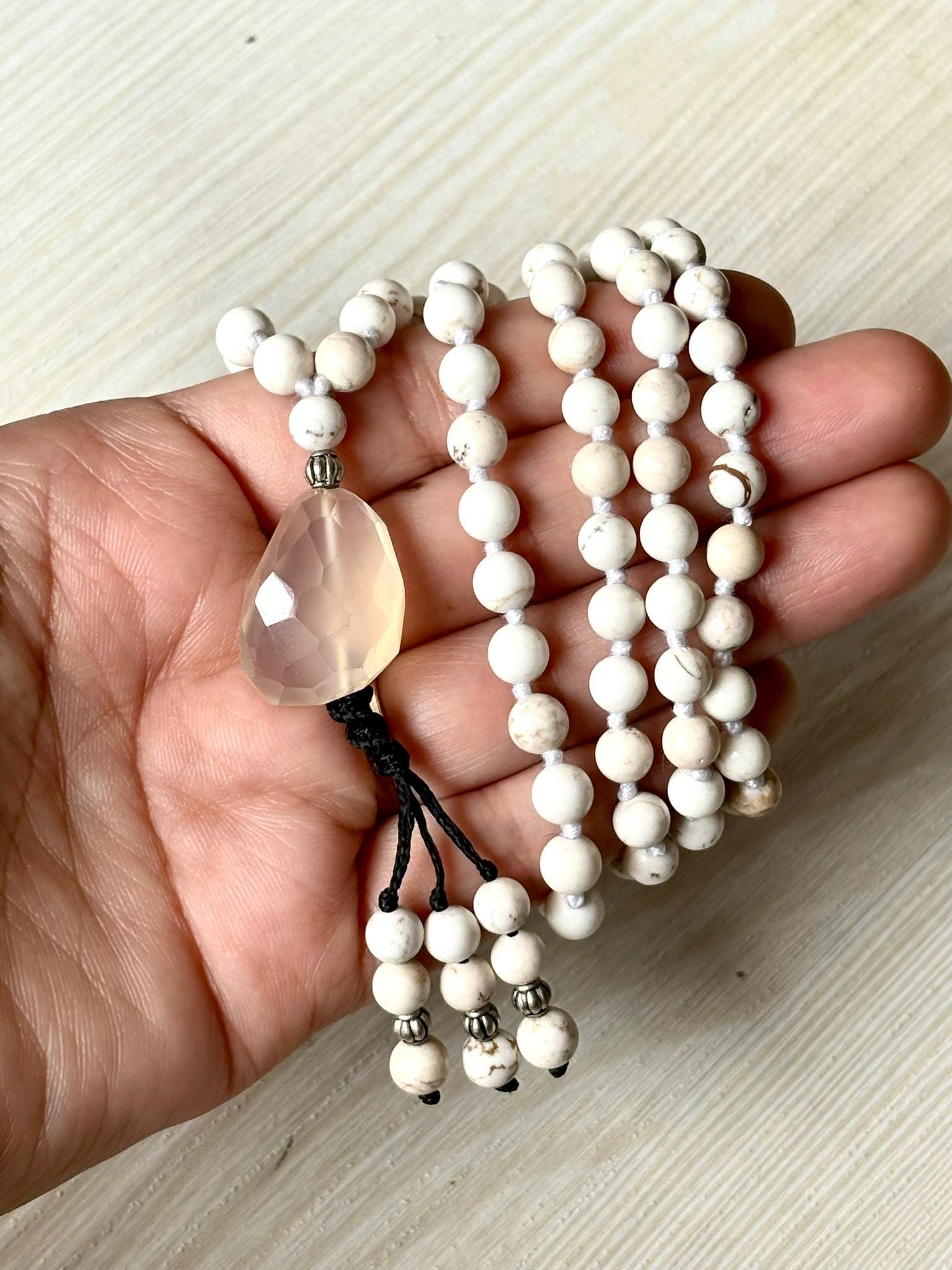Howlite Mala Necklace with Agate Pendant , 108 beaded japamala, Crystal Beaded Necklace,Yoga Gift