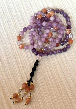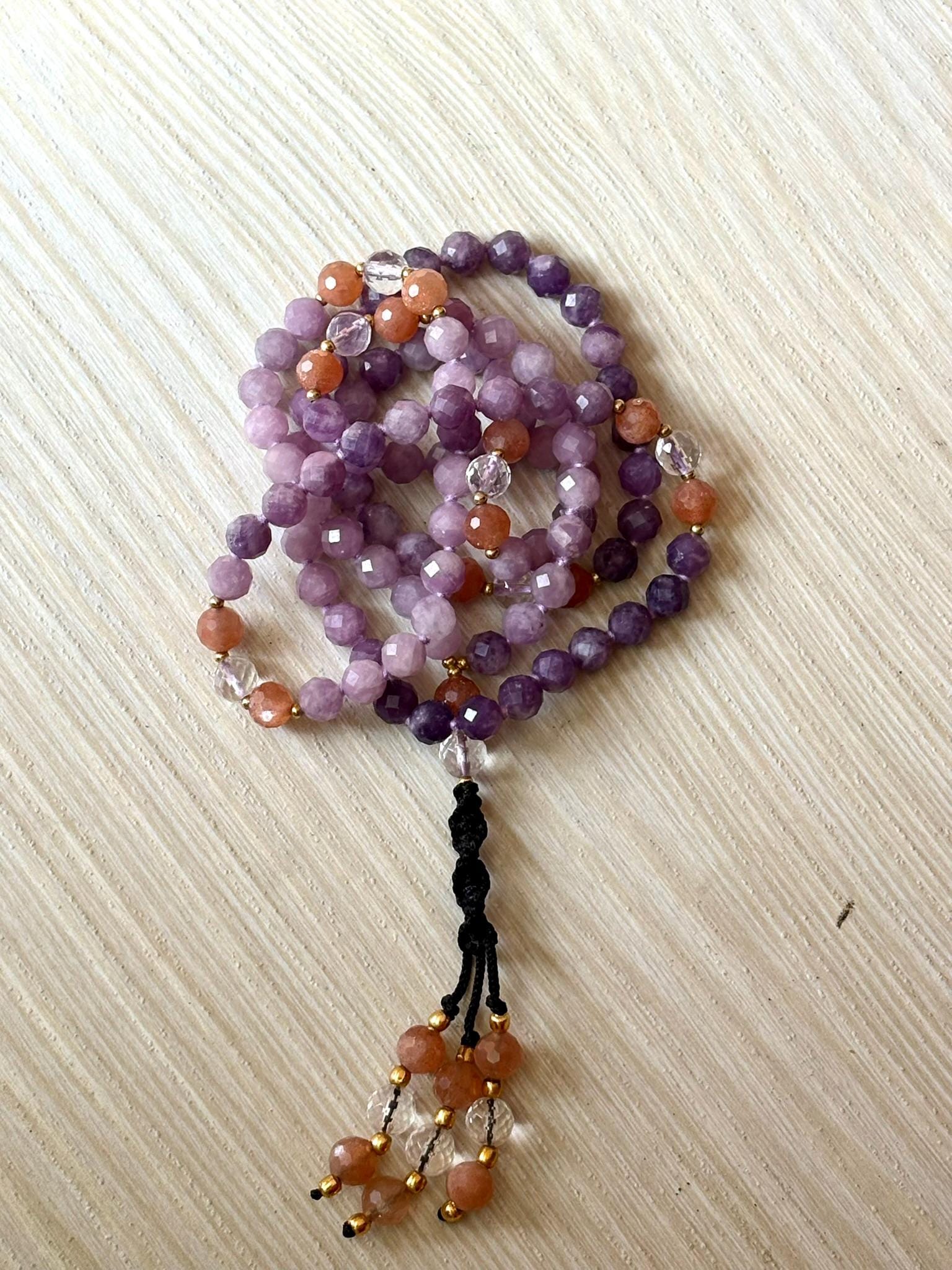 Lepidolite Mala Necklace: Sunstone & Clear Quartz, Meditation Beads