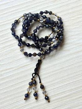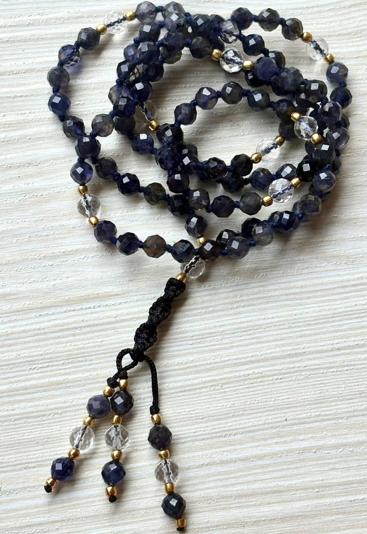 Iolite Mala Necklace with Clear Quartz | 108 Bead Prayer Mala | Spiritual Tassel Necklace | Healing Crystal Meditation Jewelry