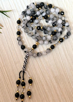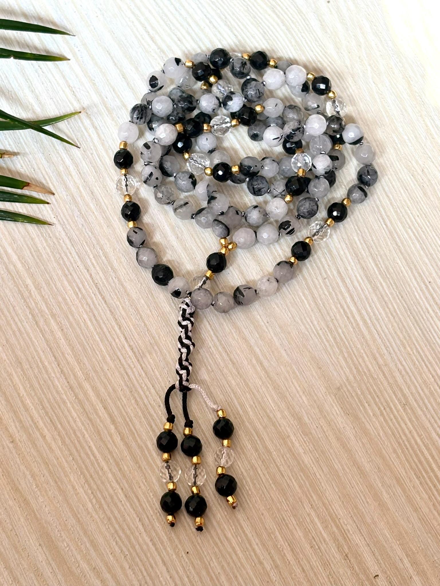 Black Rutile Quartz Mala Necklace with Clear Quartz and Black Tourmaline,Tassel mala, Prayer Necklace, 108 Mala Beads, Statement Necklace