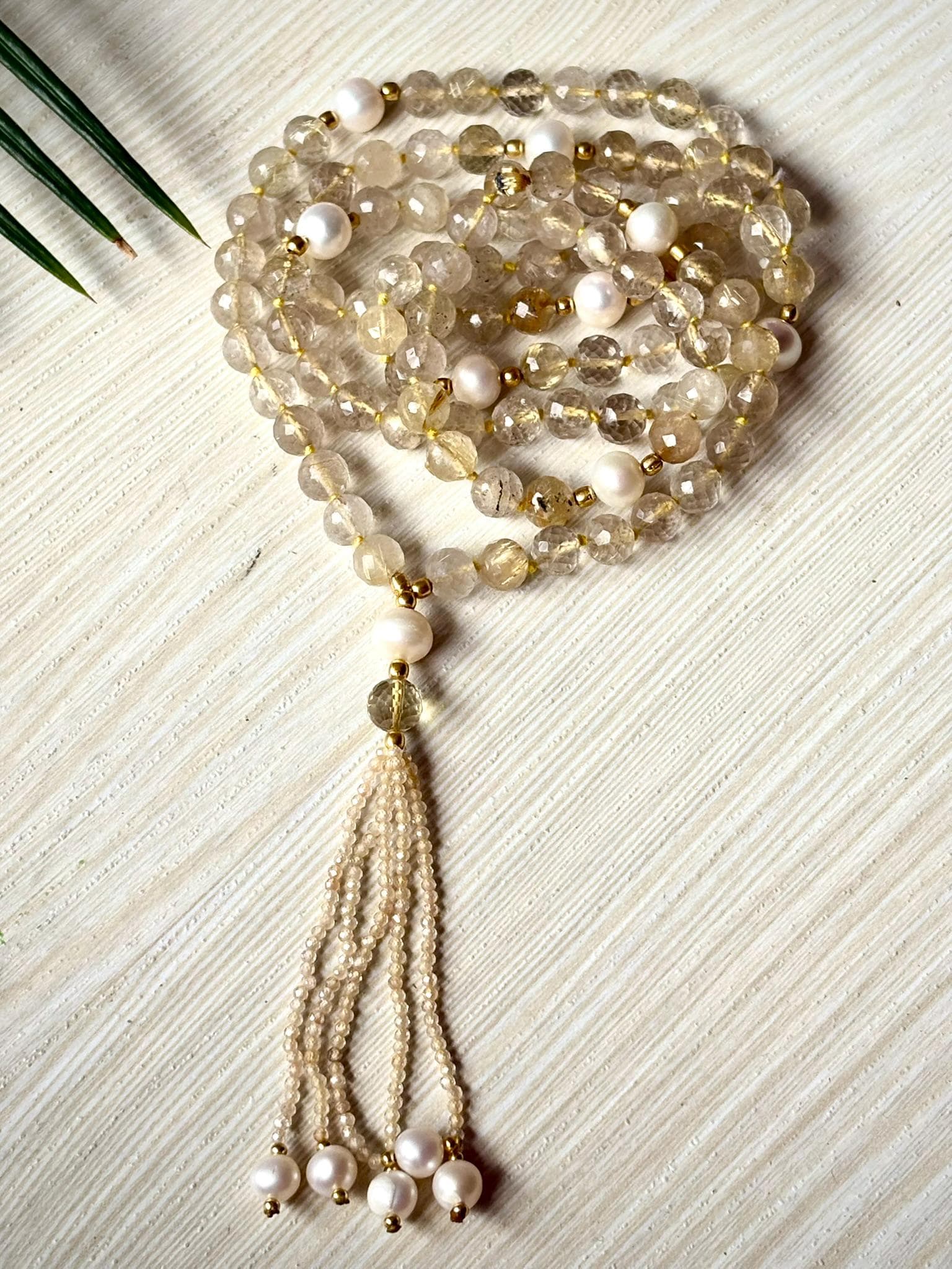 Golden Rutile Quartz Mala Necklace: Pearl Tassel, 108 Prayer Beads
