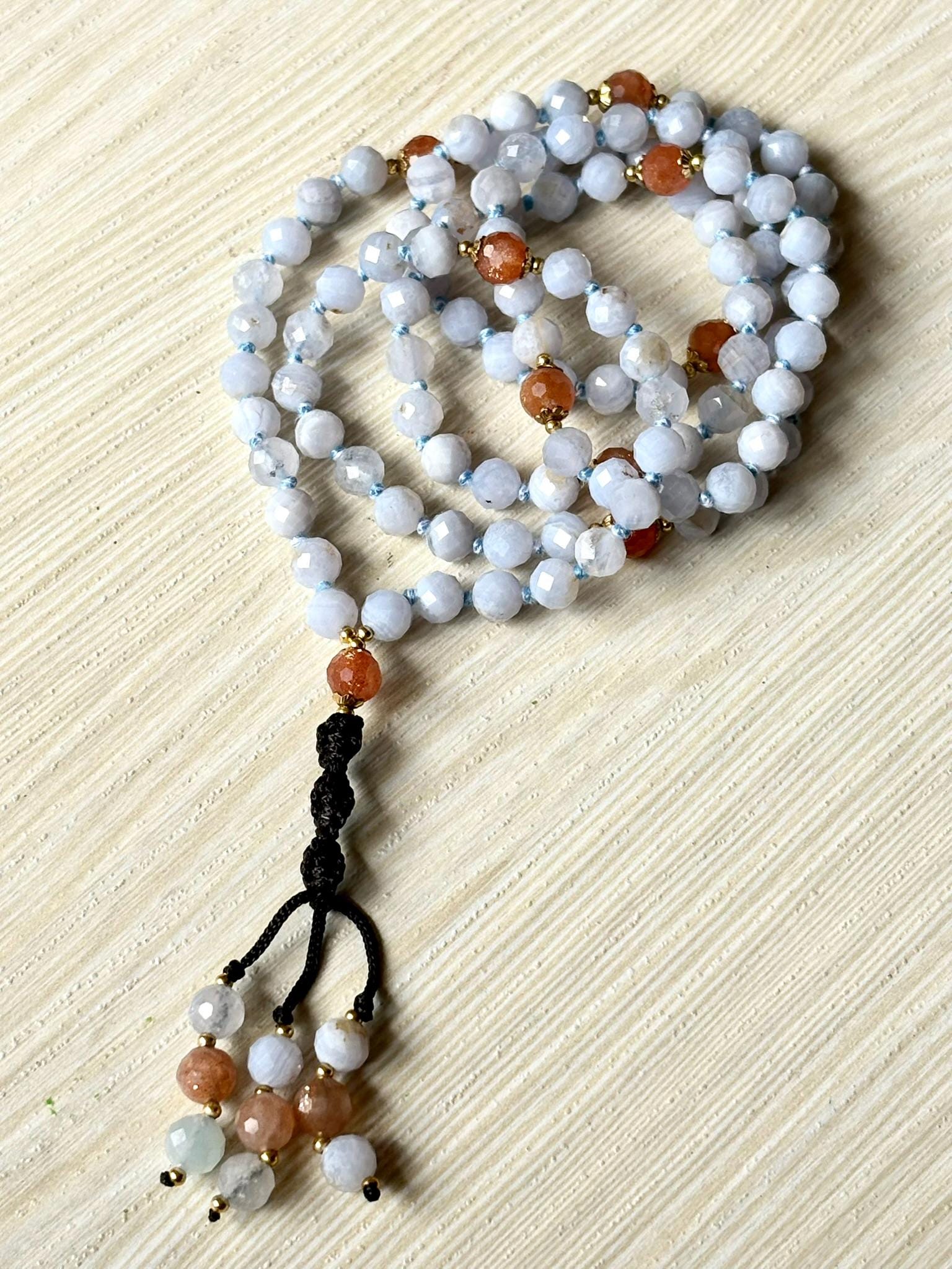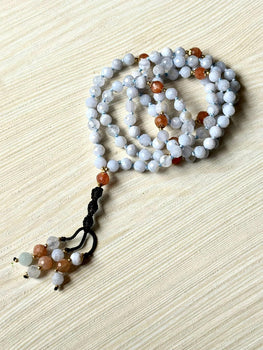 Blue Lace Agate Mala Necklace: 108 Bead Sunstone Japamala