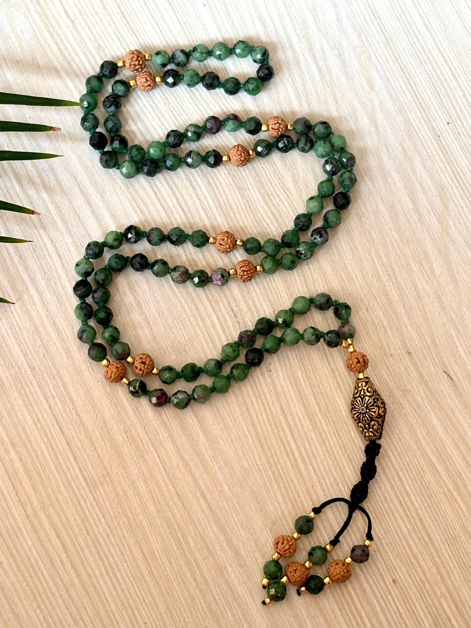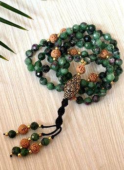 Ruby Zoisite Mala Necklace: Rudraksha 108 Prayer Beads