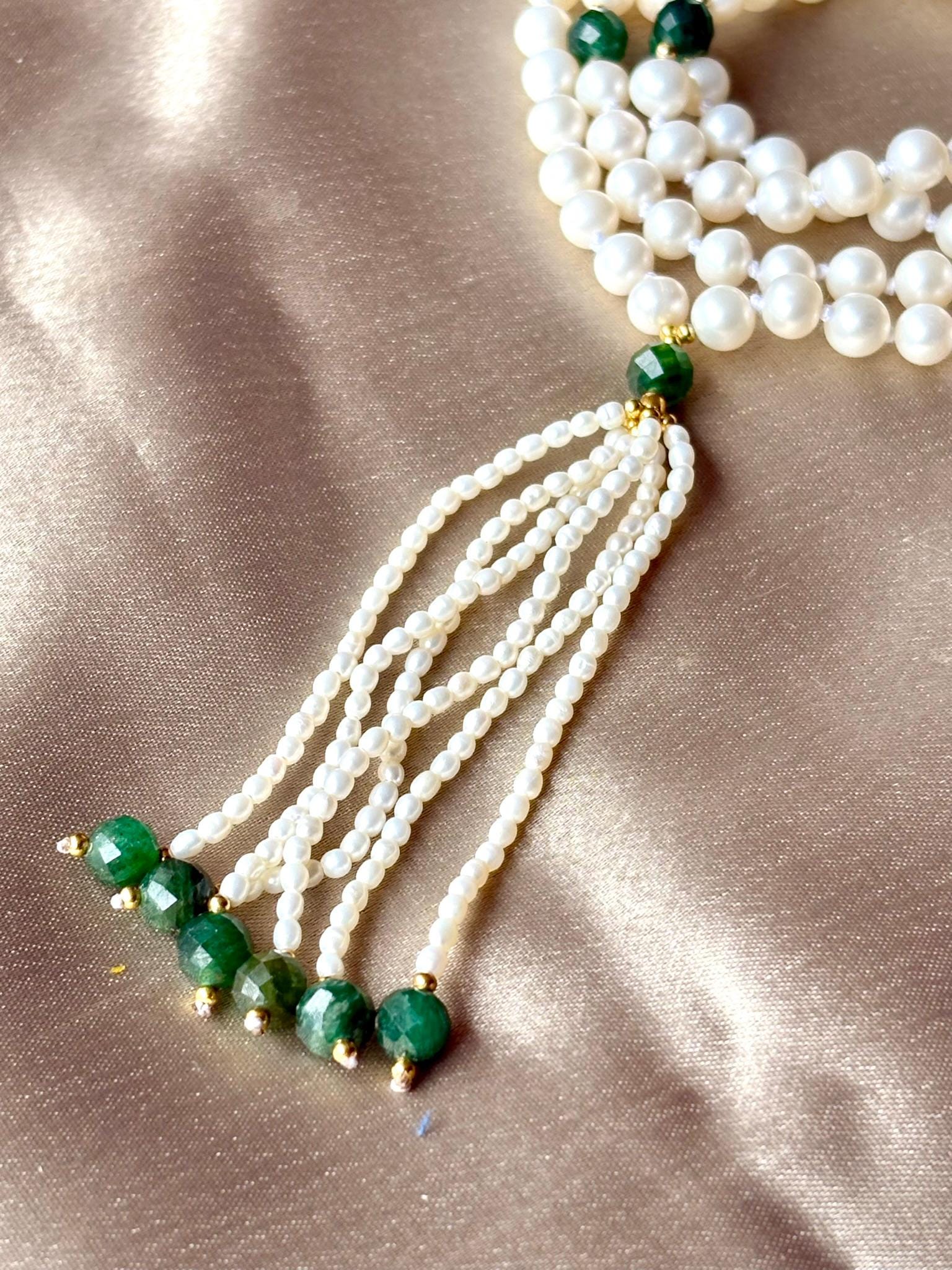 Pearl Mala Necklace with Faceted Emerald Beads,Zodiac Mala Gift,108 japa mala beaded necklace,Yoga Beaded Necklace