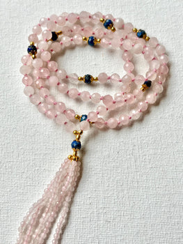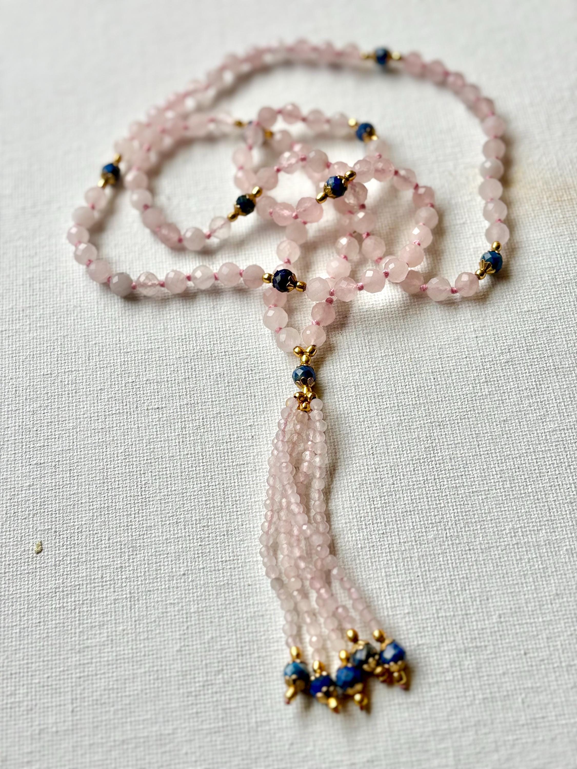 Rose Quartz Mala Necklace: Lapis Lazuli Accents, Heart Chakra Healing