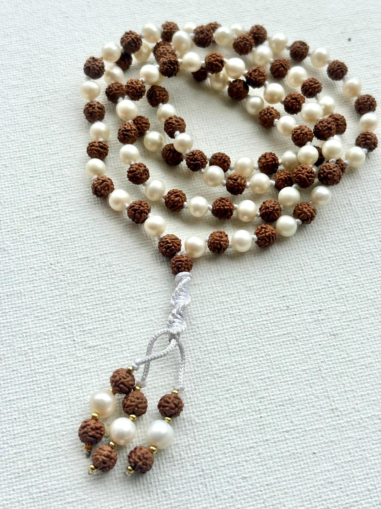 Rudraksha & Pearl 108 Bead Mala: Hand-Knotted Prayer Beads