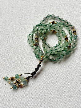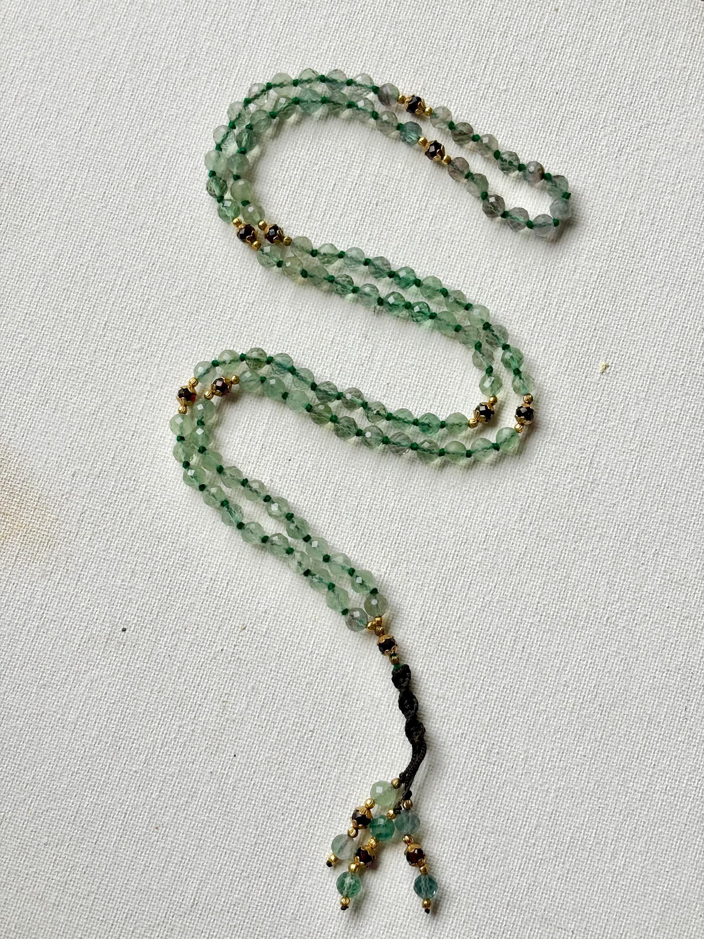 Green Fluorite Mala Necklace: 108 Beads, Garnet Accent, Meditation Jewelry