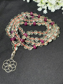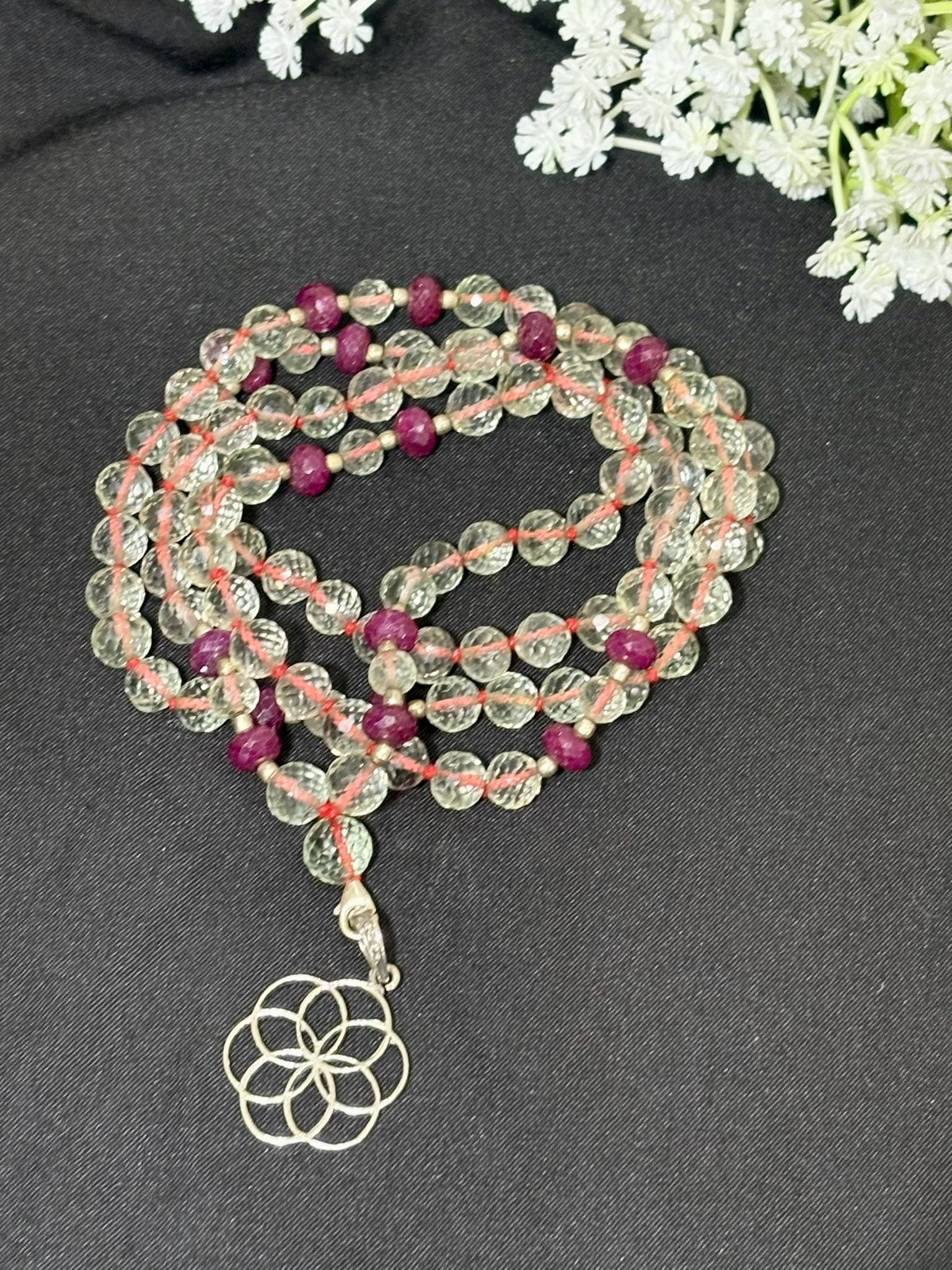 Faceted Green Amethyst Mala Necklace with Ruby Beads & Sterling Silver Flower of Life Pendant | 108 Bead Japa Mala | Healing Yoga Jewelry