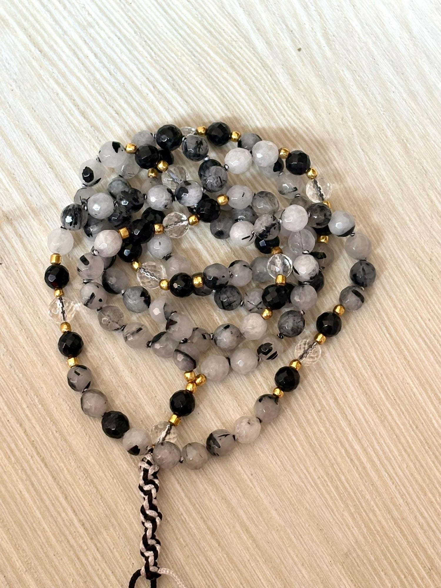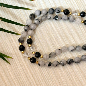 Elevate your spiritual practice with the protective and high-vibrational energy of this Faceted Black Rutile Quartz Mala Necklace, accented with Clear Quartz and Black Tourmaline.