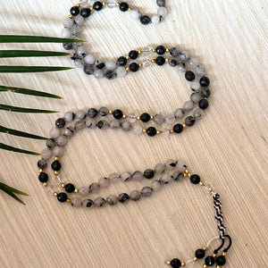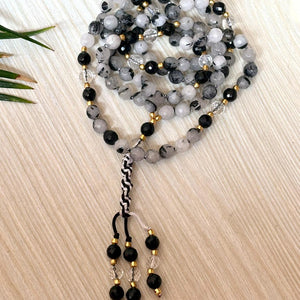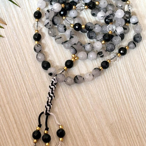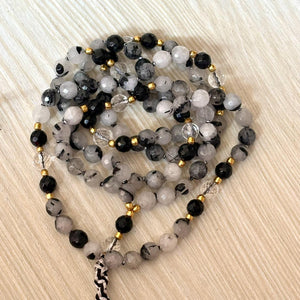 Black Rutile Quartz Mala Necklace with Clear Quartz and Black Tourmaline,Tassel mala, Prayer Necklace, 108 Mala Beads, Statement Necklace