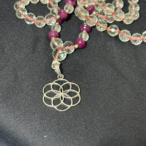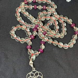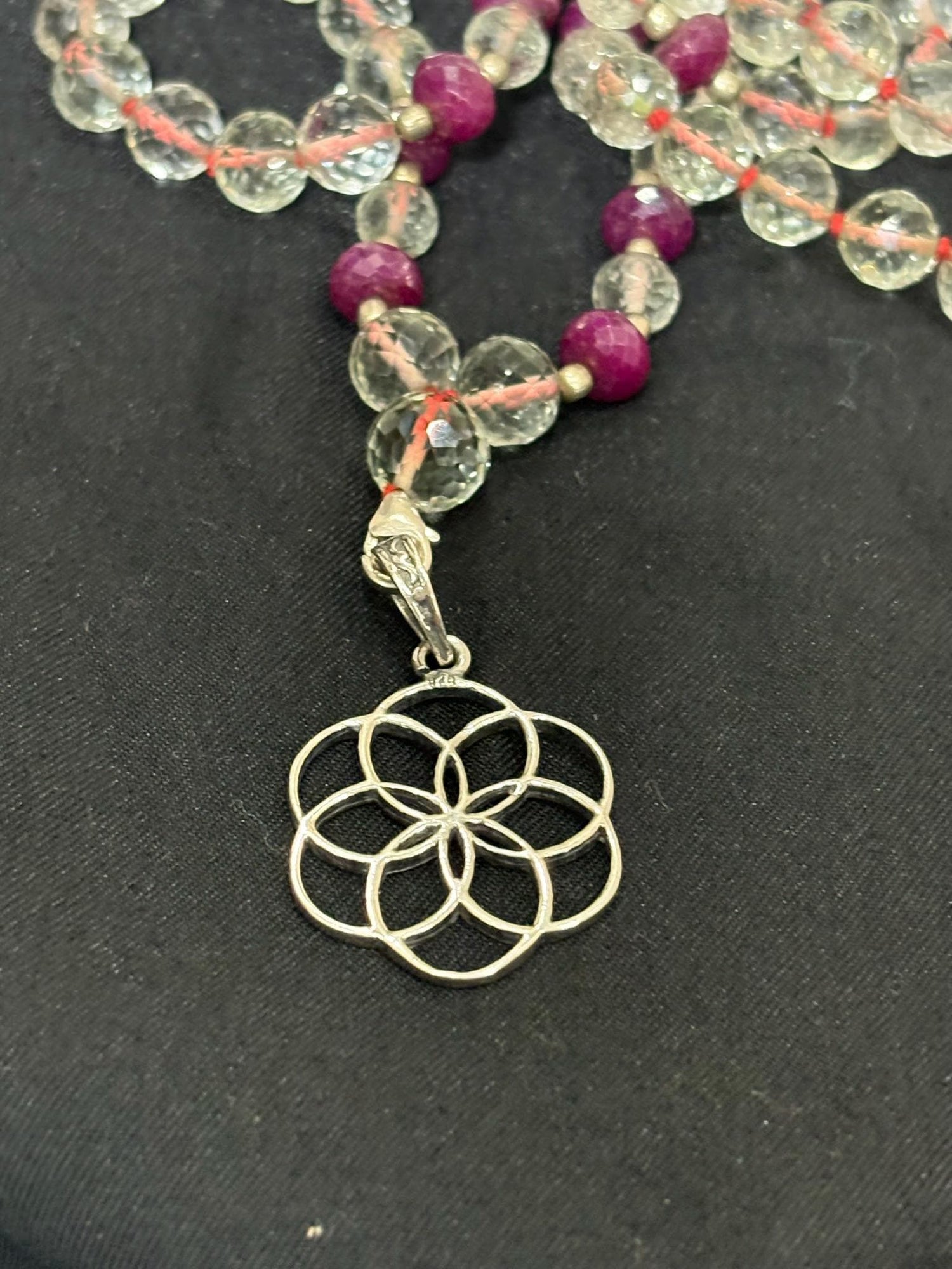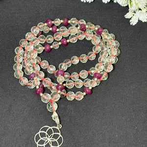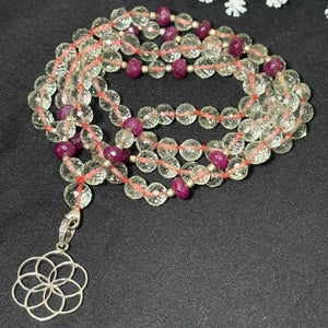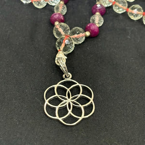 Faceted Green Amethyst Mala Necklace with Ruby Beads & Sterling Silver Flower of Life Pendant | 108 Bead Japa Mala | Healing Yoga Jewelry