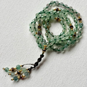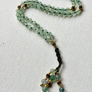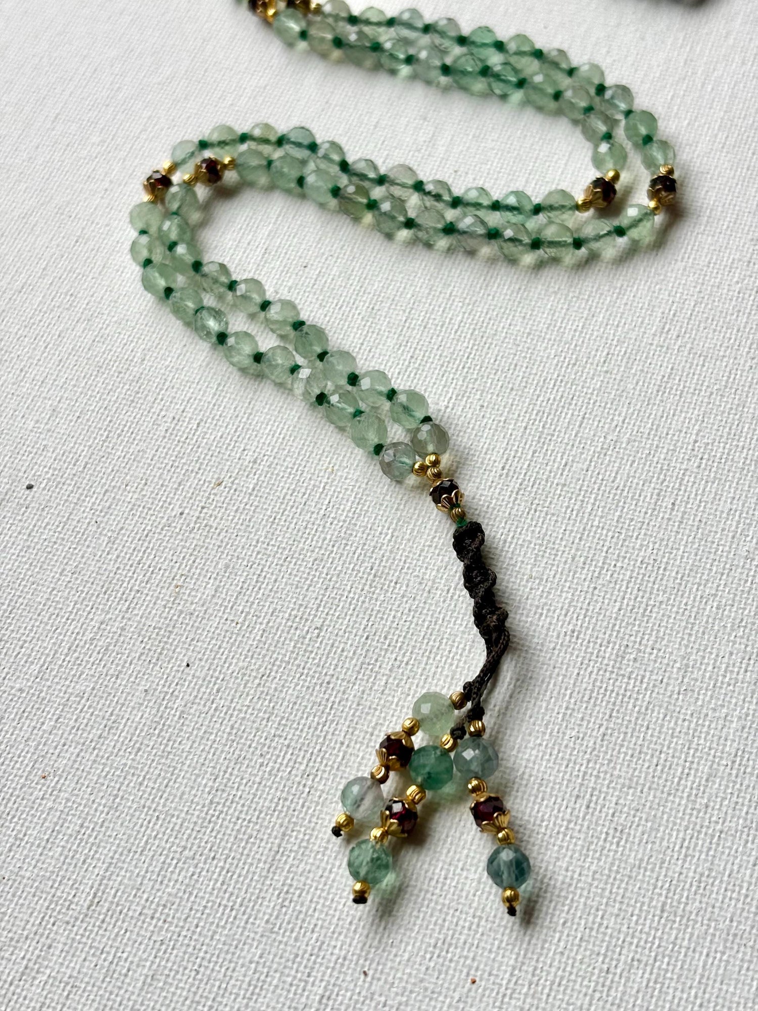 Green Fluorite Mala Necklace: 108 Beads, Garnet Accent, Meditation Jewelry