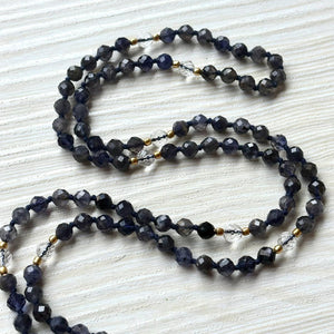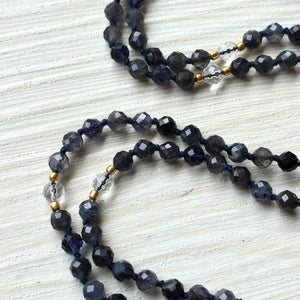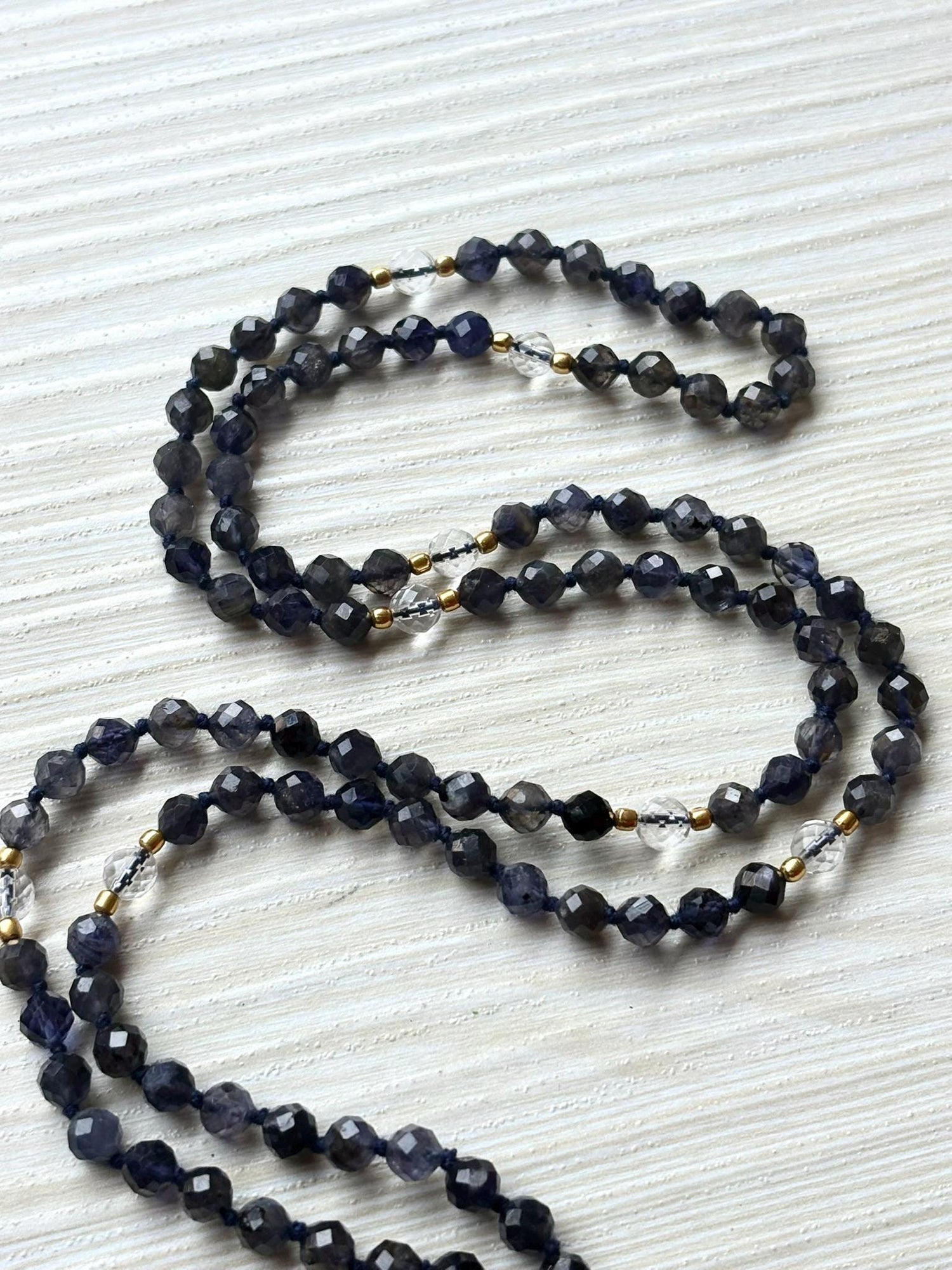 Elevate your spiritual practice with this handcrafted Iolite Mala Necklace accented with Clear Quartz.