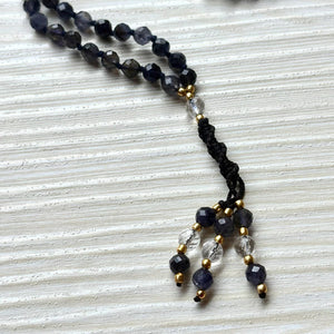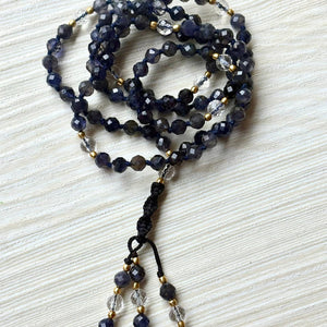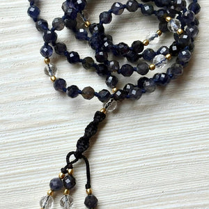 Iolite Mala Necklace with Clear Quartz | 108 Bead Prayer Mala | Spiritual Tassel Necklace | Healing Crystal Meditation Jewelry