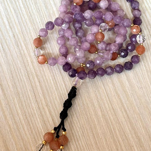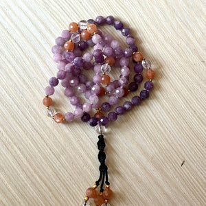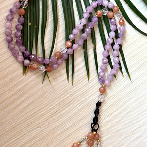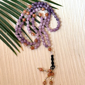Lepidolite Mala Necklace: Sunstone & Clear Quartz, Meditation Beads