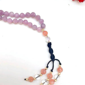 Bring emotional balance and radiant energy into your daily practice with this handcrafted 108-bead Faceted Lepidolite Mala, enhanced with uplifting Sunstone and clarifying Clear Quartz accents. Perfect for meditation, mindfulness, and spiritual rituals.
