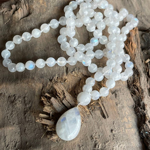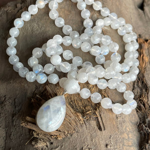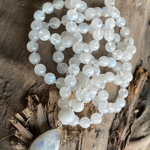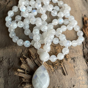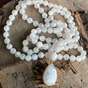 โจ Moonstone 108 bead Mala with 925 Sterling Silver Moonstone Pendant โจ