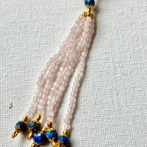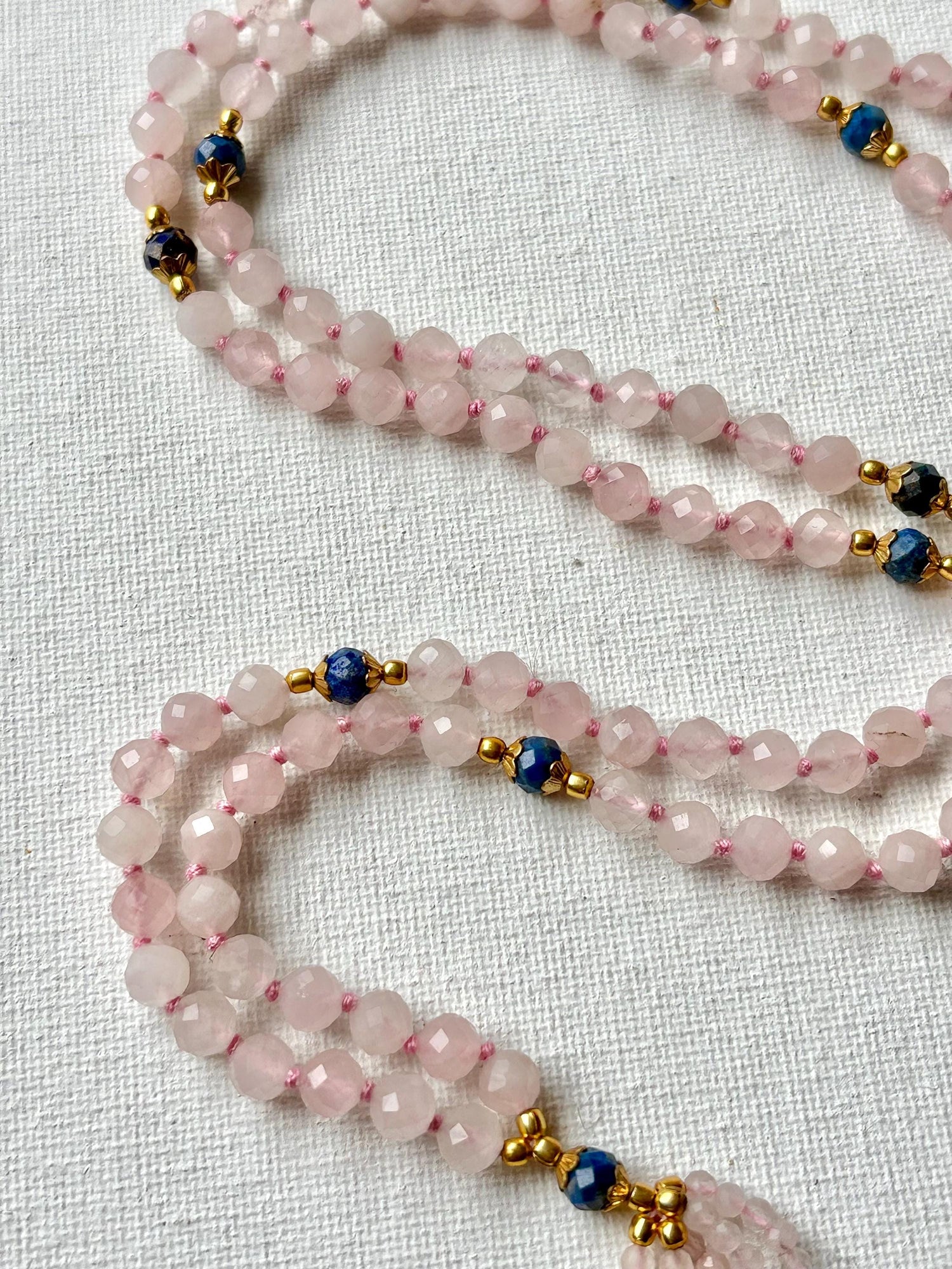 Awaken both love and wisdom with this stunning Rose Quartz Mala Necklace featuring rich Lapis Lazuli accent beads. Hand-knotted with 108 beads, this spiritual piece blends the gentle, heart-healing energy of rose quartz with the deep intuition and truth of lapis lazuli.