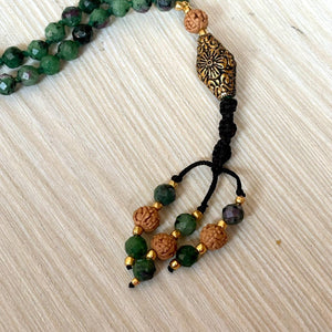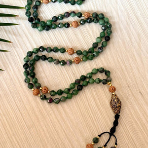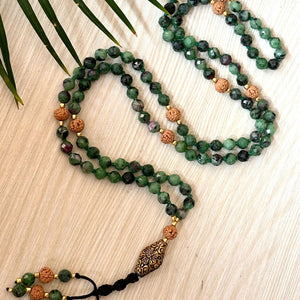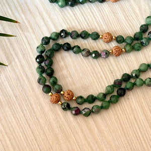Ruby Zoisite Mala Necklace: Rudraksha 108 Prayer Beads