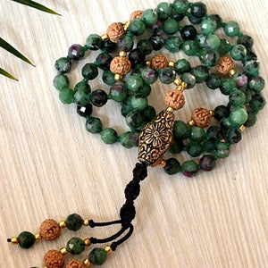 This handcrafted 108-bead mala features a stunning combination of Faceted Ruby Zoisite and Rudraksha, designed to support spiritual awakening, heart healing, and inner clarity.